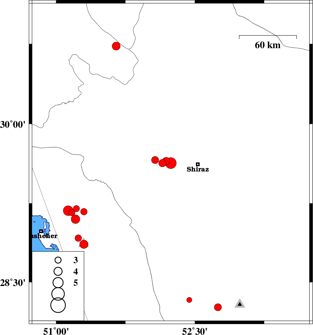 2020/01/08 | 02:15:49.2 | 05:45:49.2 | 29.2 | 51.22 | 10 | ML:3.1 | Bushehr Province, 7 km of Borazjan | ||