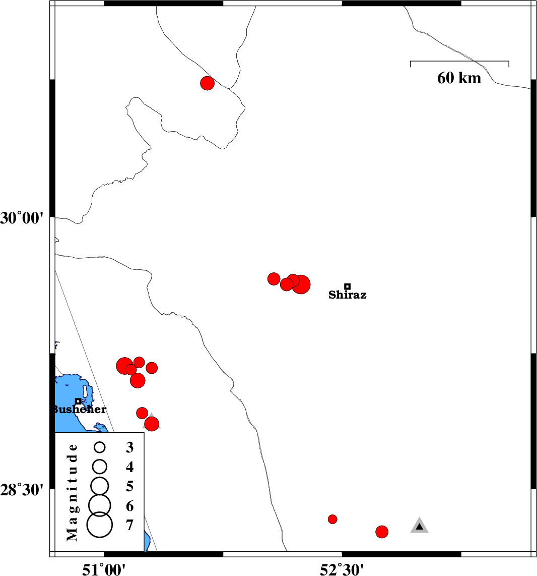 | 2020/01/08 | 03:19:14.9 | 06:49:14.9 | 29.1 | 51.21 | 10 | ML4.2 | Bushehr Province, 18 km South of Borazjan | ||