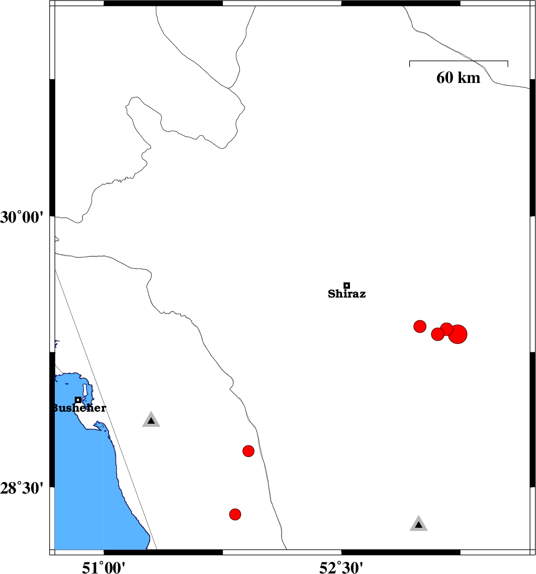 2020/01/27 | 13:28:27.1 | 16:58:27.1 | 29.63 | 52.24 | 10 | ML:5.4 | Fars Province, 28 km -West of Shiraz | ||