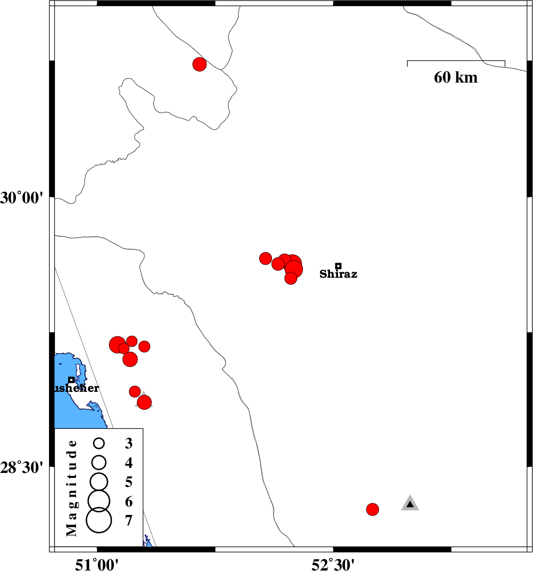 2020/01/27 | 13:28:27.1 | 16:58:27.1 | 29.63 | 52.24 | 10 | ML5.4 | Fars Province, 28 km -West of Shiraz | ||