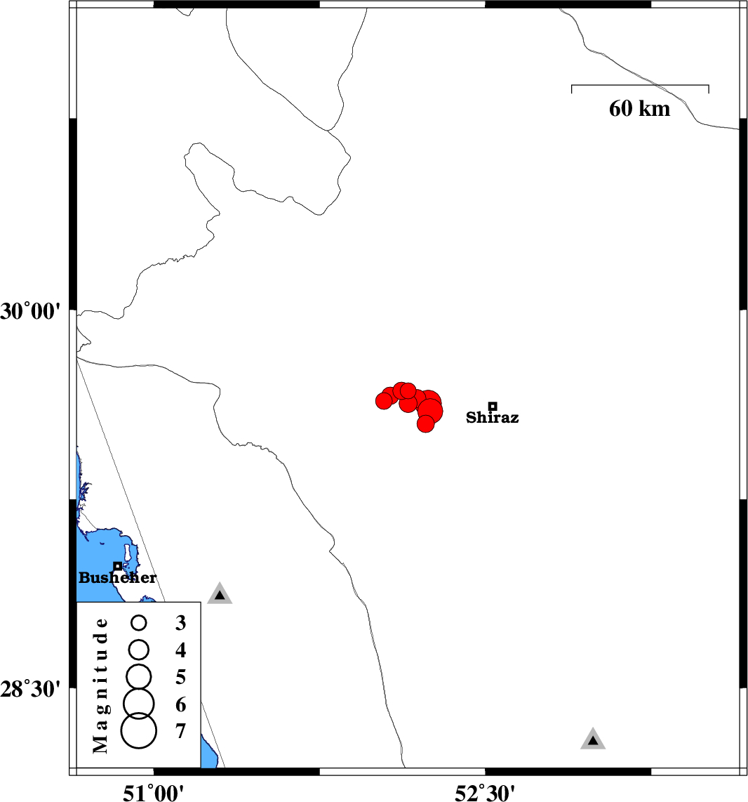 2020/01/27 | 13:28:27.1 | 16:58:27.1 | 29.63 | 52.24 | 10 | ML5.4 | Fars Province, 28 km -West of Shiraz |