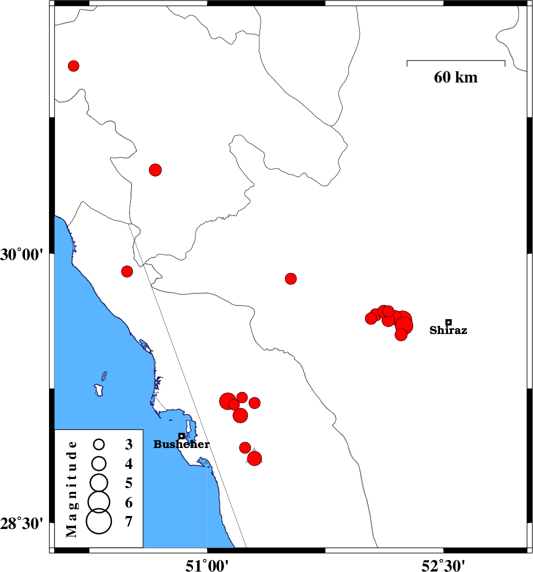 2020/01/08 | 03:46:46.7 | 07:16:46.7 | 29.16 | 51.17 | 10 | ML3.1 | Bushehr Province, 12 km South of Borazjan | ||