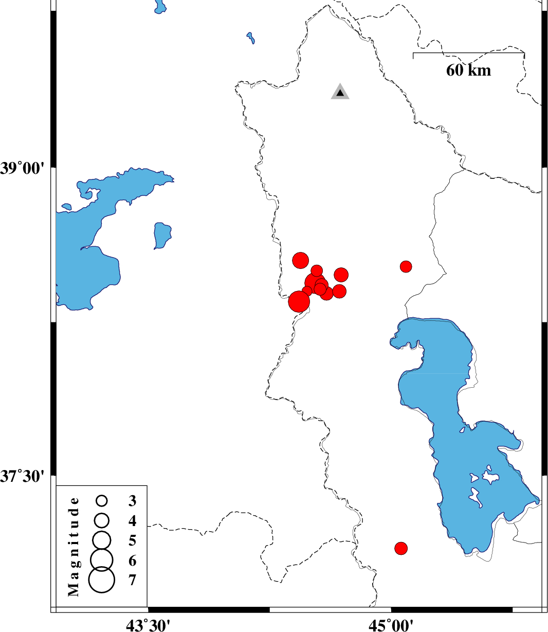 | 2020/02/23 | 16:00:33.8 | 19:30:33.8 | 38.35 | 44.43 | 10 | ML5.9 | Turkey, 35 km North-West of Salmas | ||
