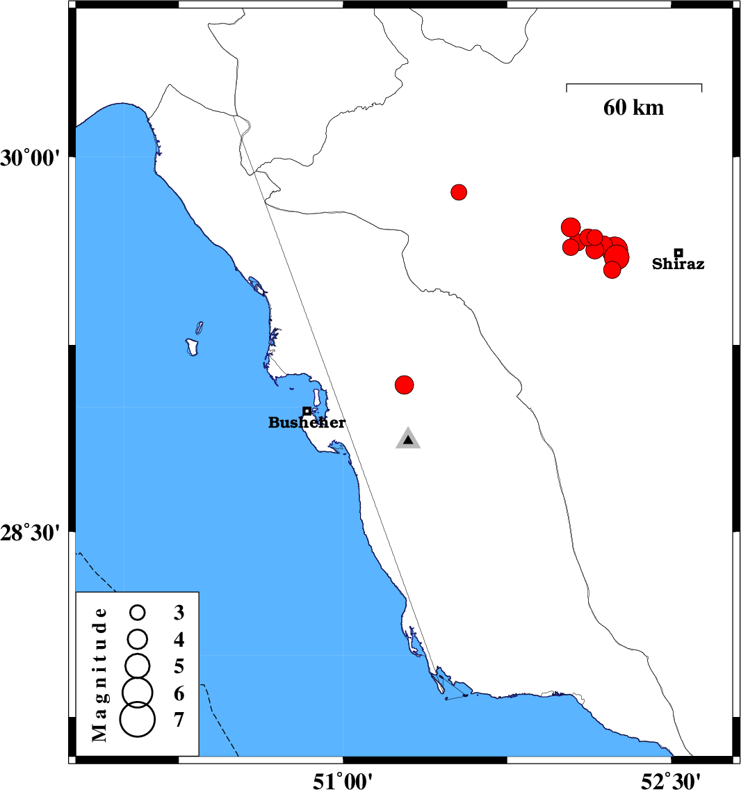| 2020/01/27 | 13:28:27.1 | 16:58:27.1 | 29.63 | 52.24 | 10 | ML5.4 | Fars Province, 28 km -West of Shiraz |