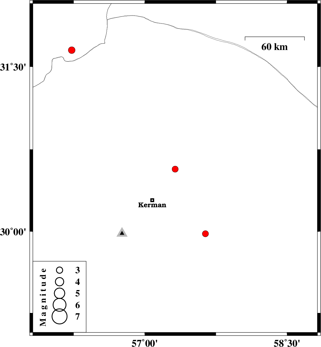 | 2020/02/15 | 14:49:25.6 | 18:19:25.6 | 29.98 | 57.64 | 10 | ML3 | Kerman Province, 64 km South-East of Kerman |
