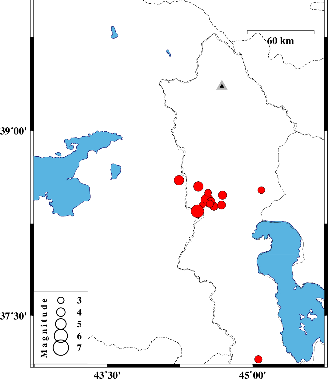 | 2020/02/23 | 16:00:33.8 | 19:30:33.8 | 38.35 | 44.43 | 10 | ML5.9 | Turkey, 35 km North-West of Salmas | ||