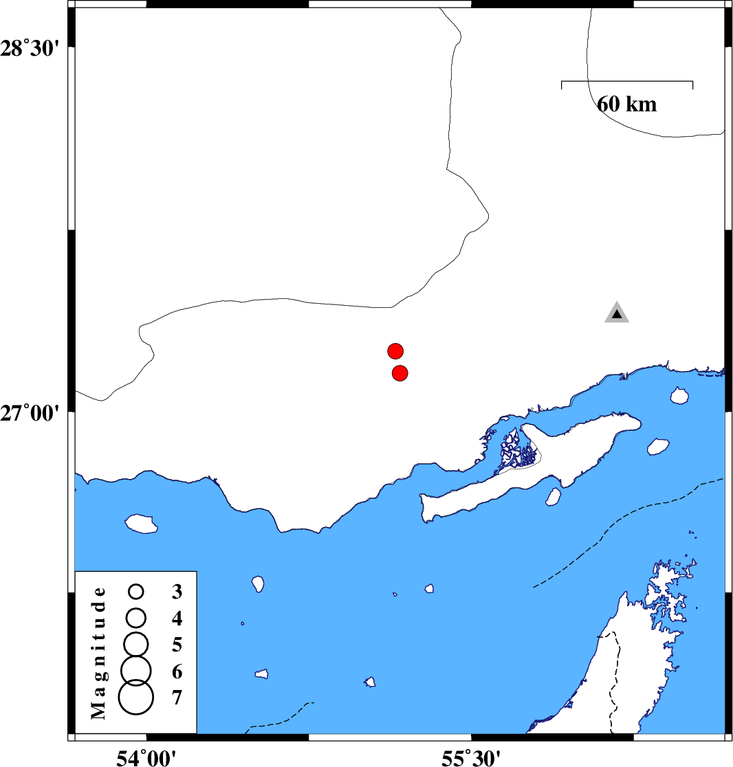 | 2020/03/13 | 11:48:18.6 | 15:18:18.6 | 27.16 | 55.17 | 20 | ML3.2 | Hormozgan Province, 80 km -East of Bastak |