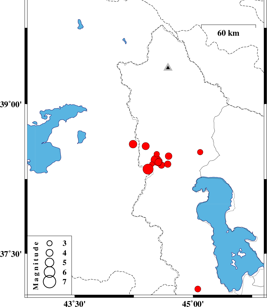 | 2020/02/23 | 05:53:00.6 | 09:23:00.6 | 38.44 | 44.53 | 10 | ML5.8 | Azarbaijan Gharbi Province, 35 km North-West of Salmas | ||