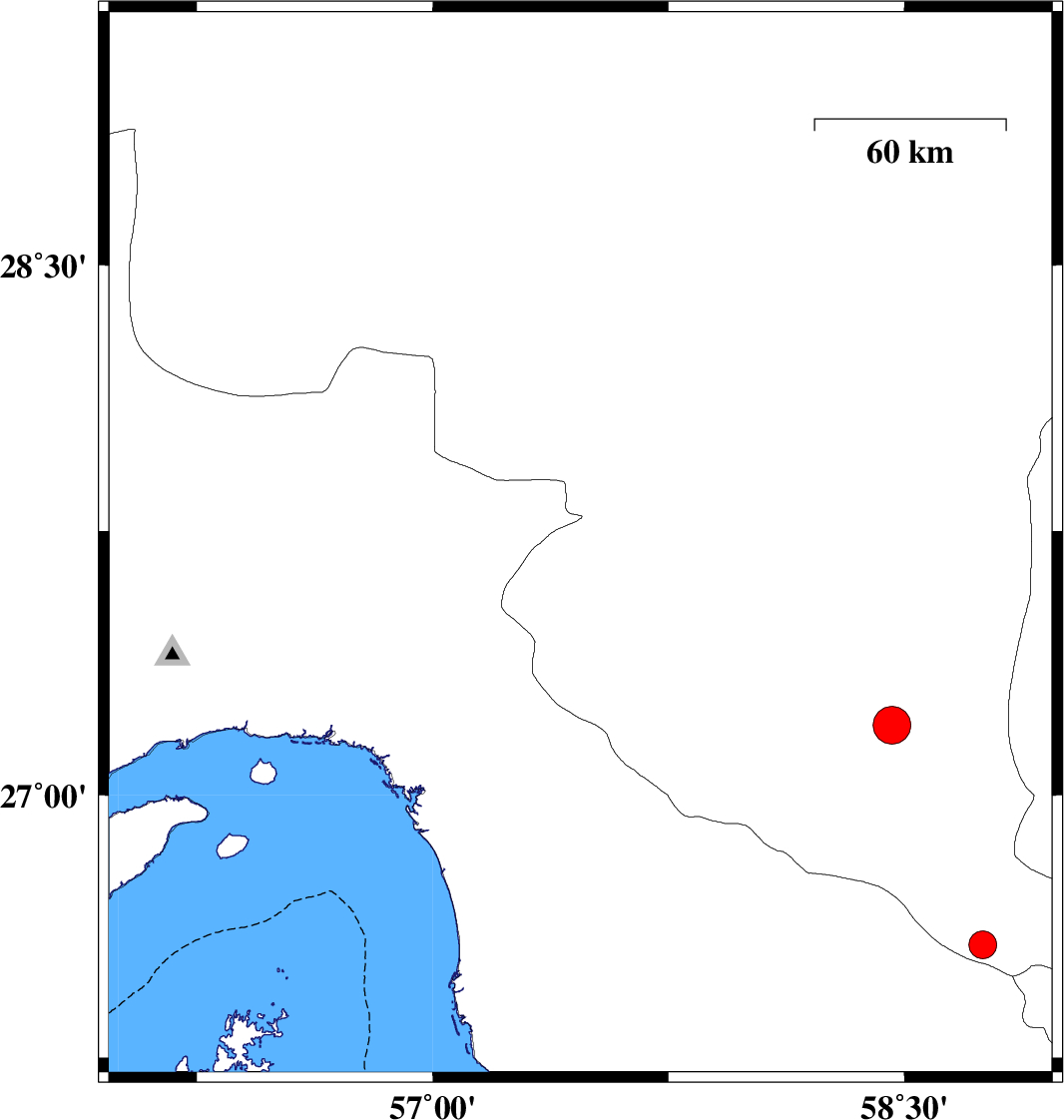 | 2020/03/27 | 06:40:44.6 | 11:10:44.6 | 28.33 | 57.18 | 15 | ML5.3 | Kerman Province, 66 km North-West of Kahnuj |