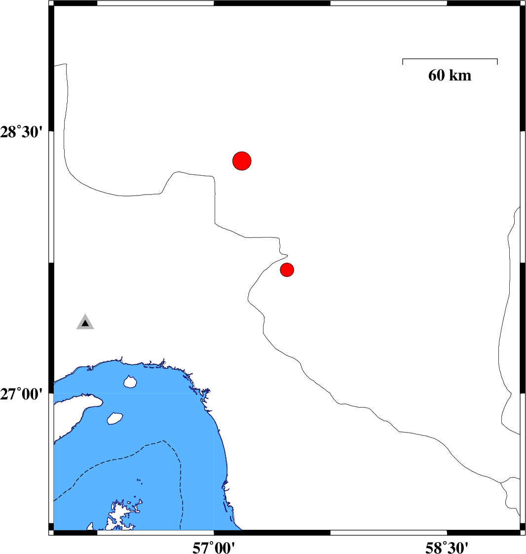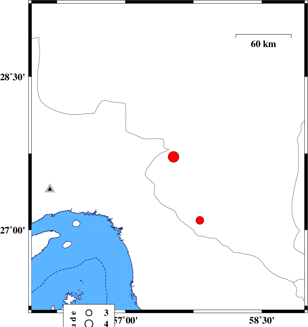 | 2020/03/27 | 06:40:44.6 | 11:10:44.6 | 28.33 | 57.18 | 15 | ML5.3 | Kerman Province, 66 km North-West of Kahnuj |