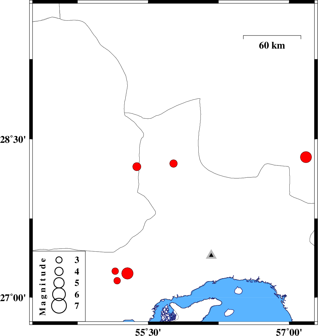 | 2020/03/27 | 06:40:44.6 | 11:10:44.6 | 28.33 | 57.18 | 15 | ML5.3 | Kerman Province, 66 km North-West of Kahnuj | ||