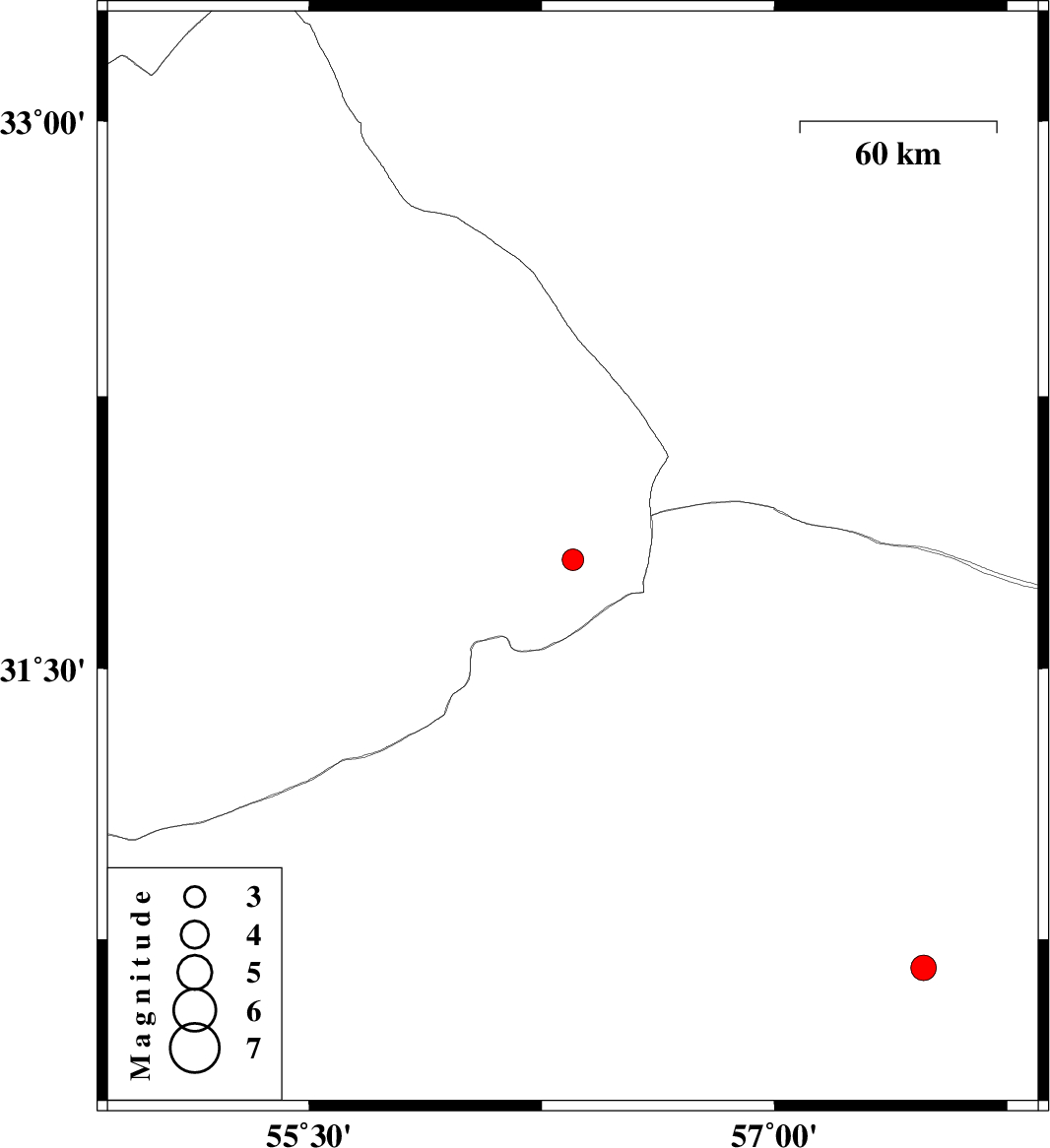 | 2020/03/29 | 03:45:11.8 | 08:15:11.8 | 30.67 | 57.48 | 10 | ML3.7 | Kerman Province, 57 km North-East of Kerman |