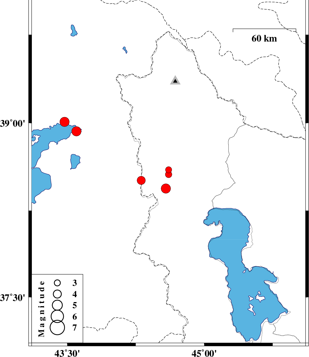 | 2020/04/03 | 09:42:45.8 | 14:12:45.8 | 38.51 | 44.31 | 10 | ML4.1 | Turkey, 63 km South of Seyah Cheshmah | ||