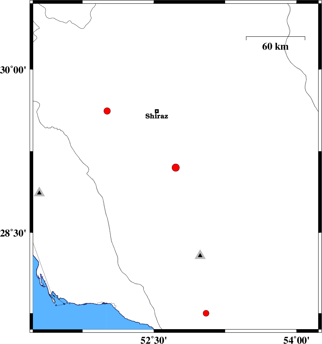 | 2020/04/20 | 17:44:06.7 | 22:14:06.7 | 29.62 | 52.01 | 12 | ML3.1 | Fars Province, 34 km -East of Kazerun |