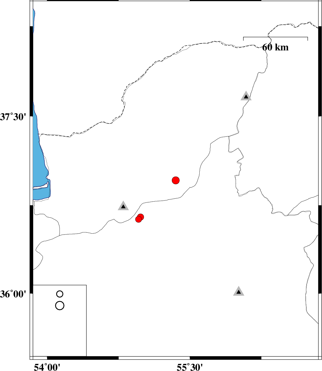 | 2020/04/26 | 18:30:57.2 | 23:00:57.2 | 36.96 | 55.35 | 10 | ML3.5 | Golestan Province, 19 km -East of Ramian | ||