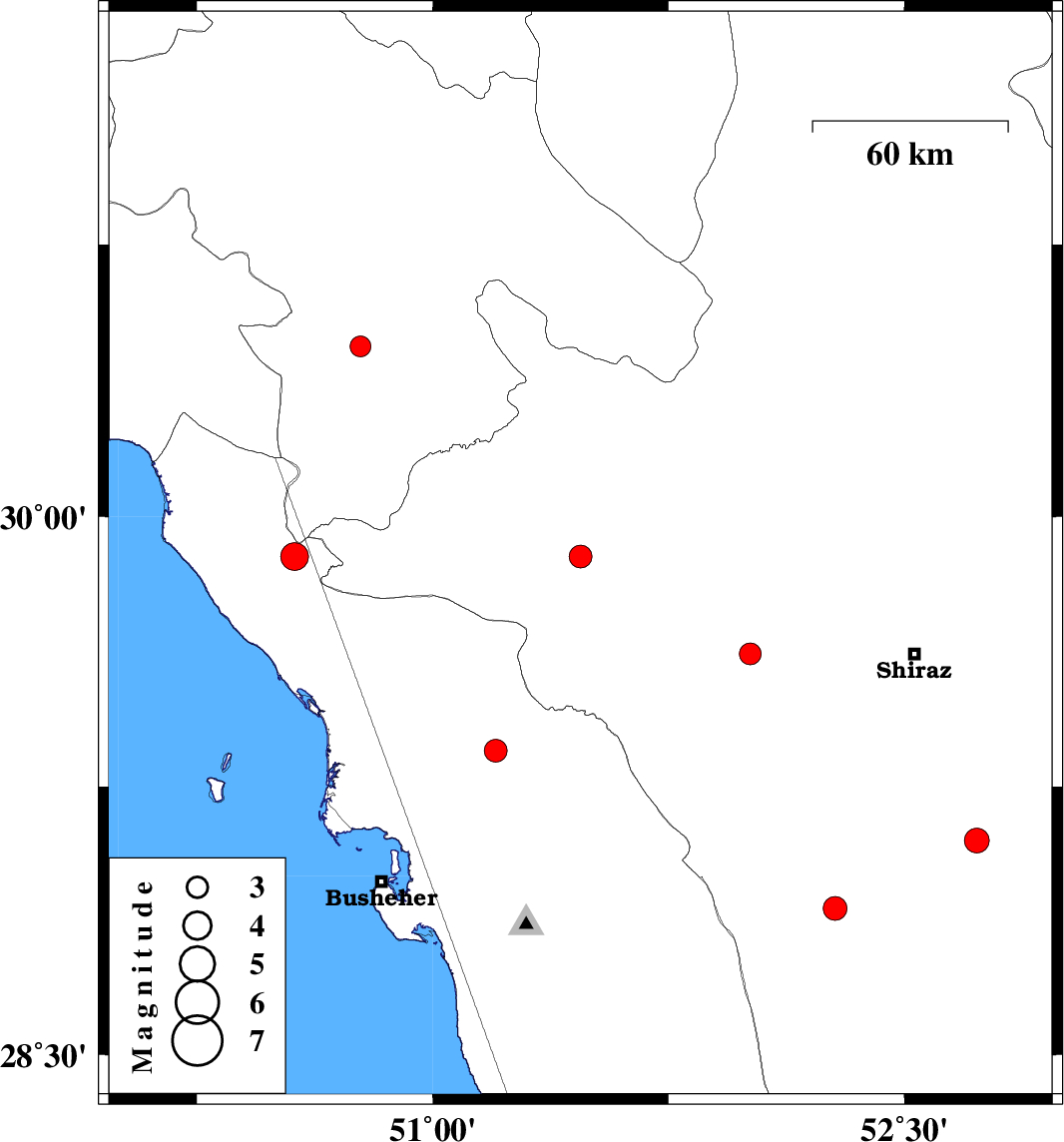 | 2020/04/04 | 01:06:57.2 | 05:36:57.2 | 29.35 | 51.2 | 10 | ML3.3 | Bushehr Province, 10 km of Borazjan |