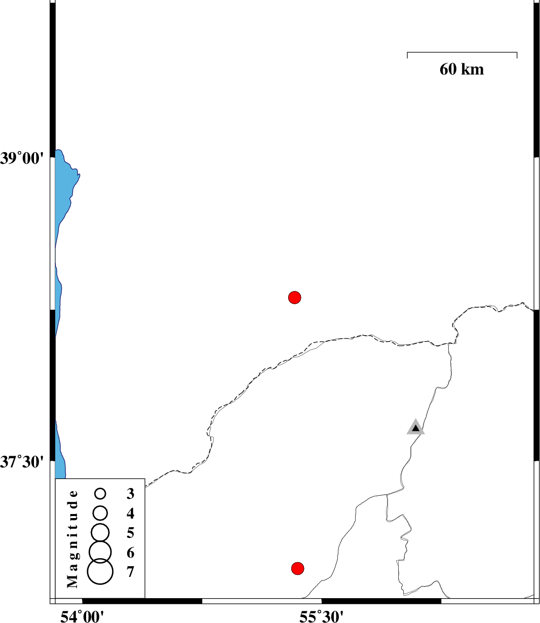 | 2020/04/26 | 18:30:57.2 | 23:00:57.2 | 36.96 | 55.35 | 10 | ML3.5 | Golestan Province, 19 km -East of Ramian |