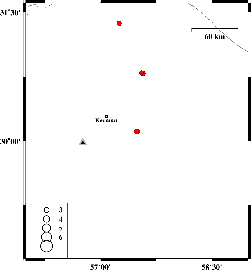 | 2020/04/20 | 05:43:41.9 | 10:13:41.9 | 30.79 | 57.57 | 10 | ML3.1 | Kerman Province, 73 km North-East of Kerman | ||