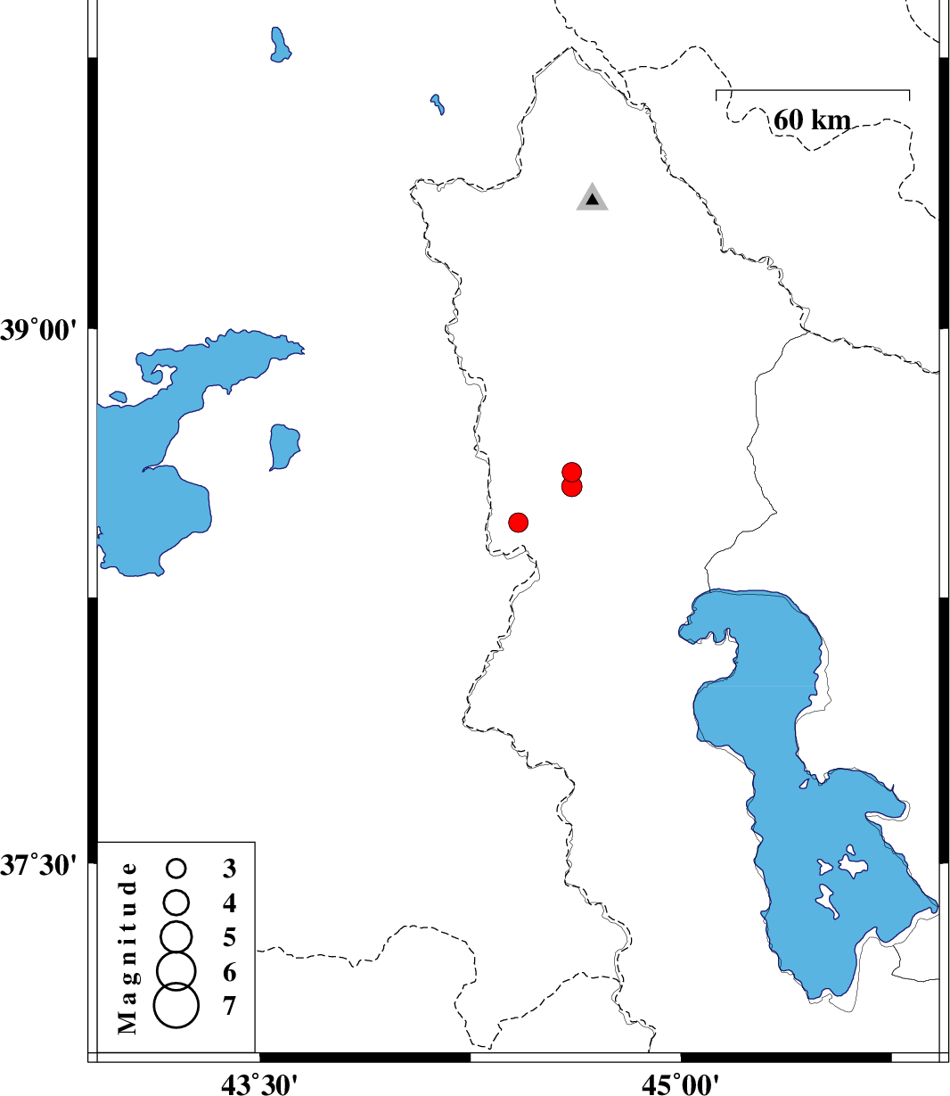 | 2020/04/23 | 06:46:22.2 | 11:16:22.2 | 38.56 | 44.61 | 12 | ML3.3 | Azarbaijan Gharbi Province, 29 km -West of Khoy |