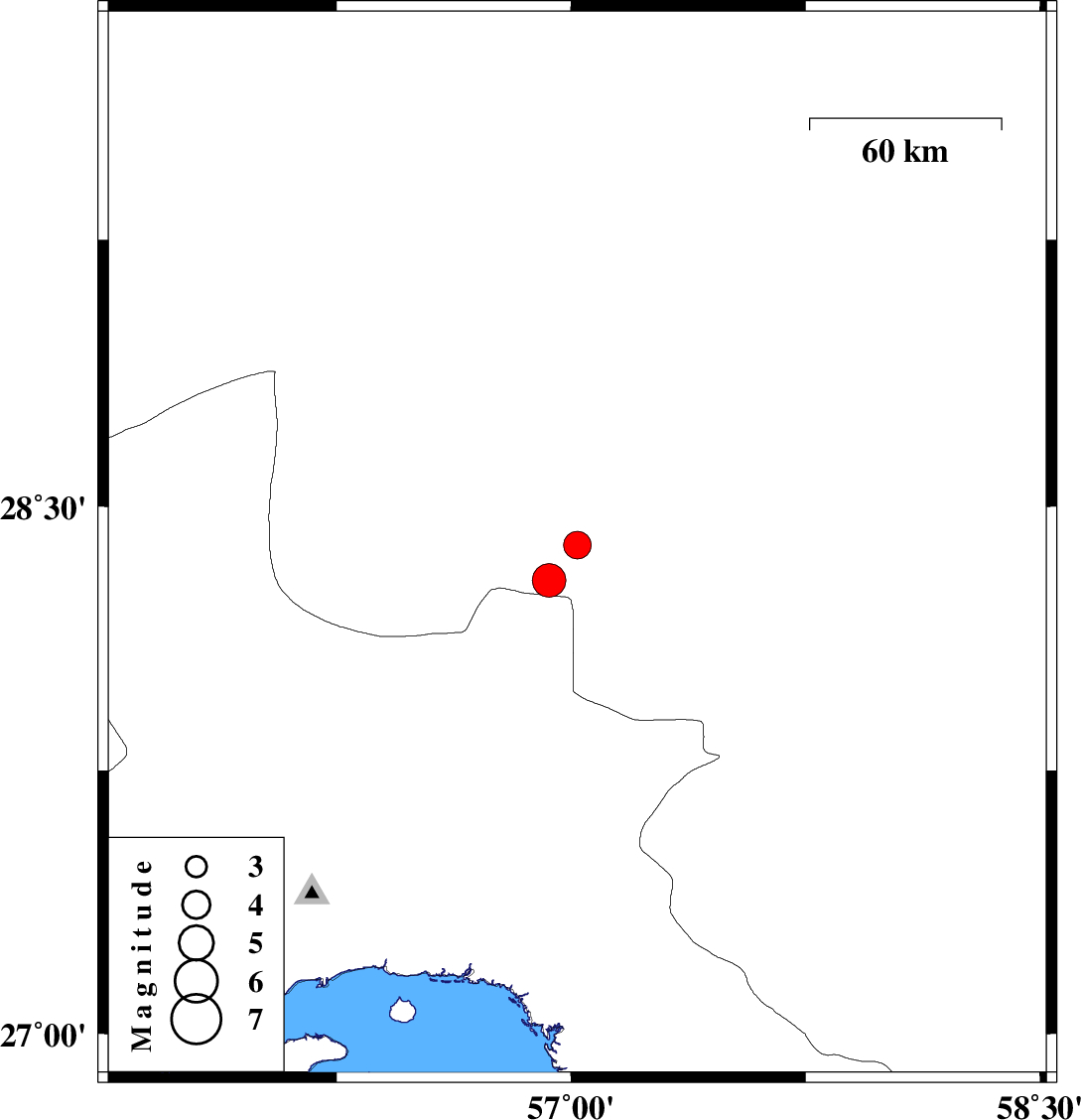 | 2020/05/01 | 20:28:10.2 | 00:58:10.2 | 28.29 | 56.93 | 15 | ML4.8 | Kerman Province, 101 km -East of Hajiabad |