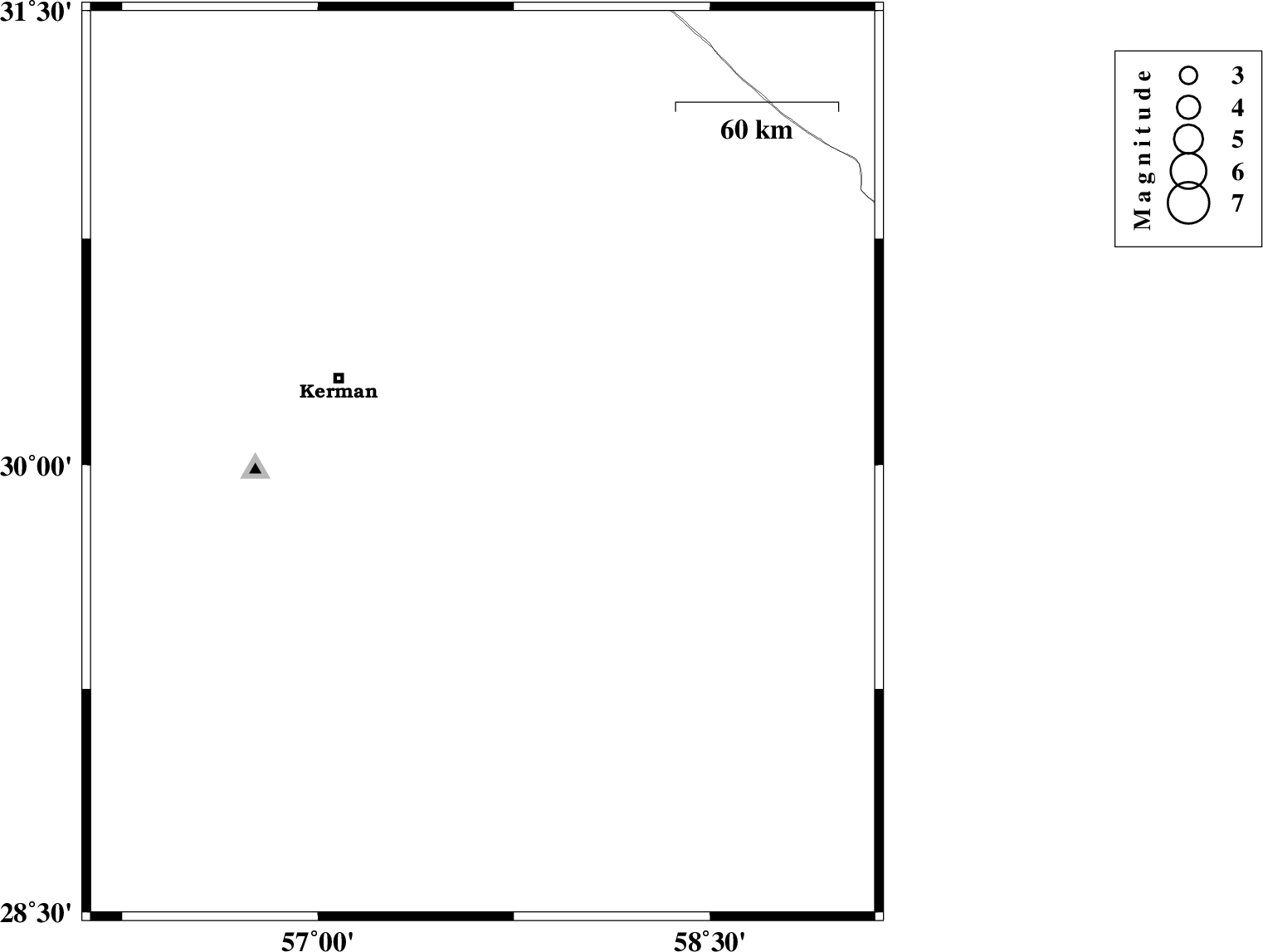 | 2020/05/19 | 05:59:11.0 | 10:29:11.0 | 30 | 57.63 | 10 | ML3.5 | Kerman Province, 62 km South-East of Kerman |