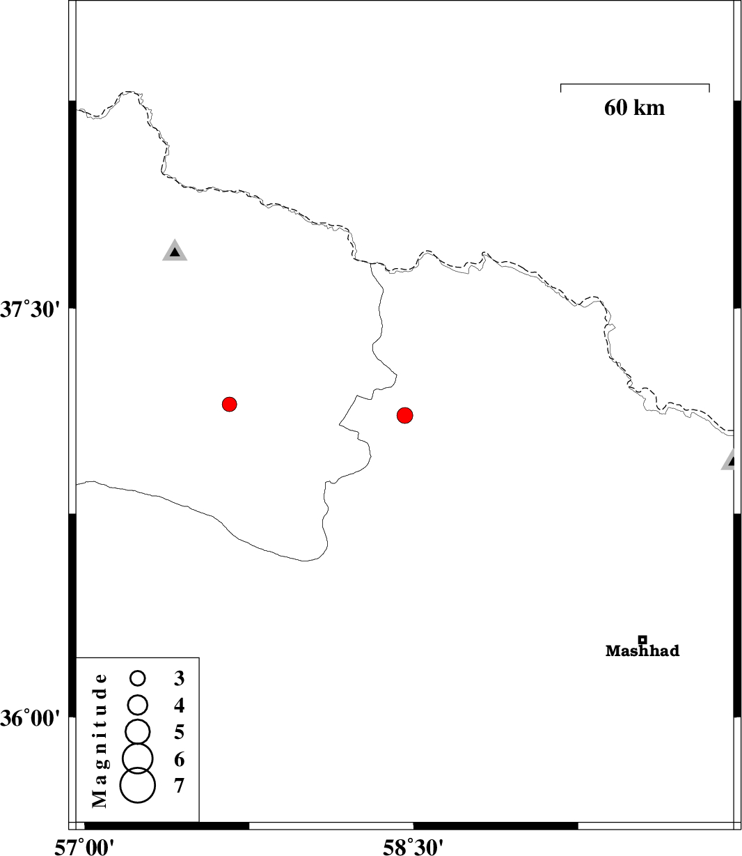 | 2020/06/14 | 00:55:58.2 | 05:25:58.2 | 37.11 | 58.46 | 10 | ML3.2 | Khorasan(center) Province, 4 km of Quchan | ||
