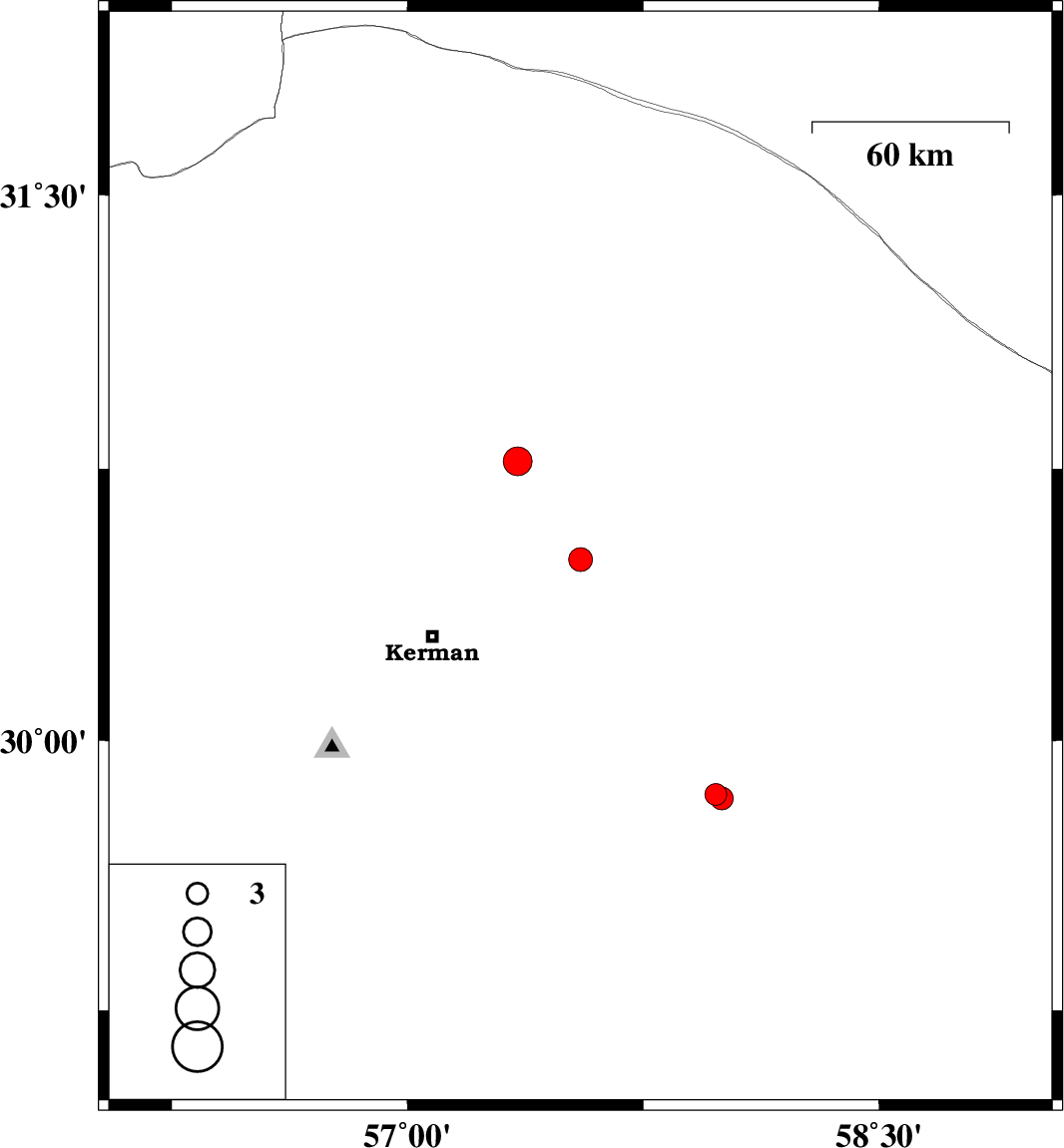 2020/06/27 | 07:48:03.3 | 12:18:03.3 | 30.77 | 57.35 | 10 | ML4.1 | Kerman Province, 60 km North-East of Kerman | ||