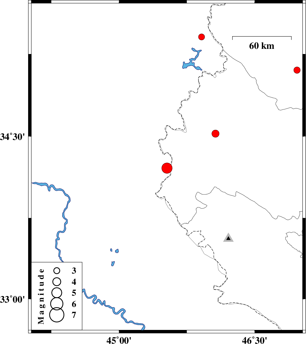 | 2020/08/09 | 09:16:19.9 | 13:46:19.9 | 34.21 | 45.53 | 10 | ML5.2 | Iraq, 34 km South of Qasr-E-Shirin | ||