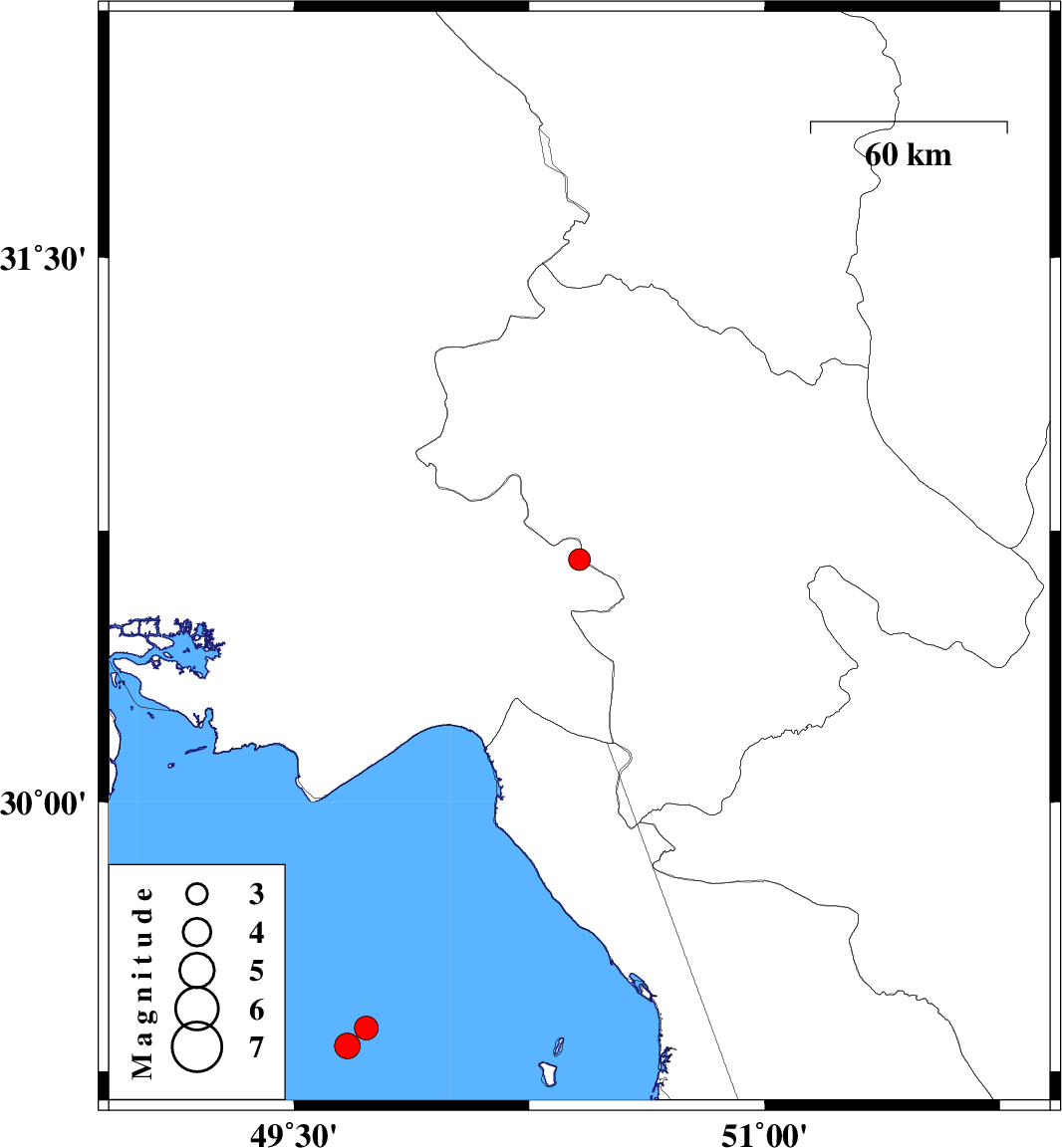 | 2020/09/18 | 04:14:26.6 | 08:44:26.6 | 29.37 | 49.73 | 23 | ML3.4 | Persian Gulf, 96 km South of Hendijan |