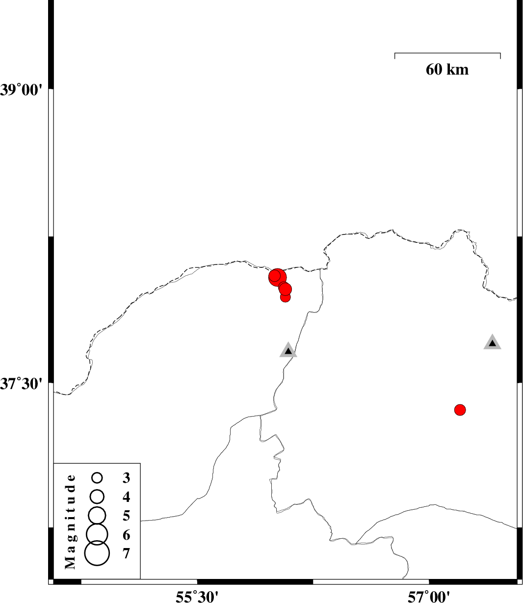 | 2020/09/26 | 05:46:54.2 | 09:16:54.2 | 38.04 | 56.02 | 10 | ML5.2 | Golestan Province, 87 km North-East of Kalaleh | ||