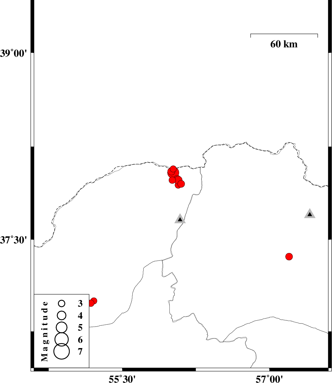 | 2020/09/30 | 04:47:11.3 | 08:17:11.3 | 37.95 | 56.1 | 10 | ML3.2 | Golestan Province, 83 km North-East of Kalaleh | ||
