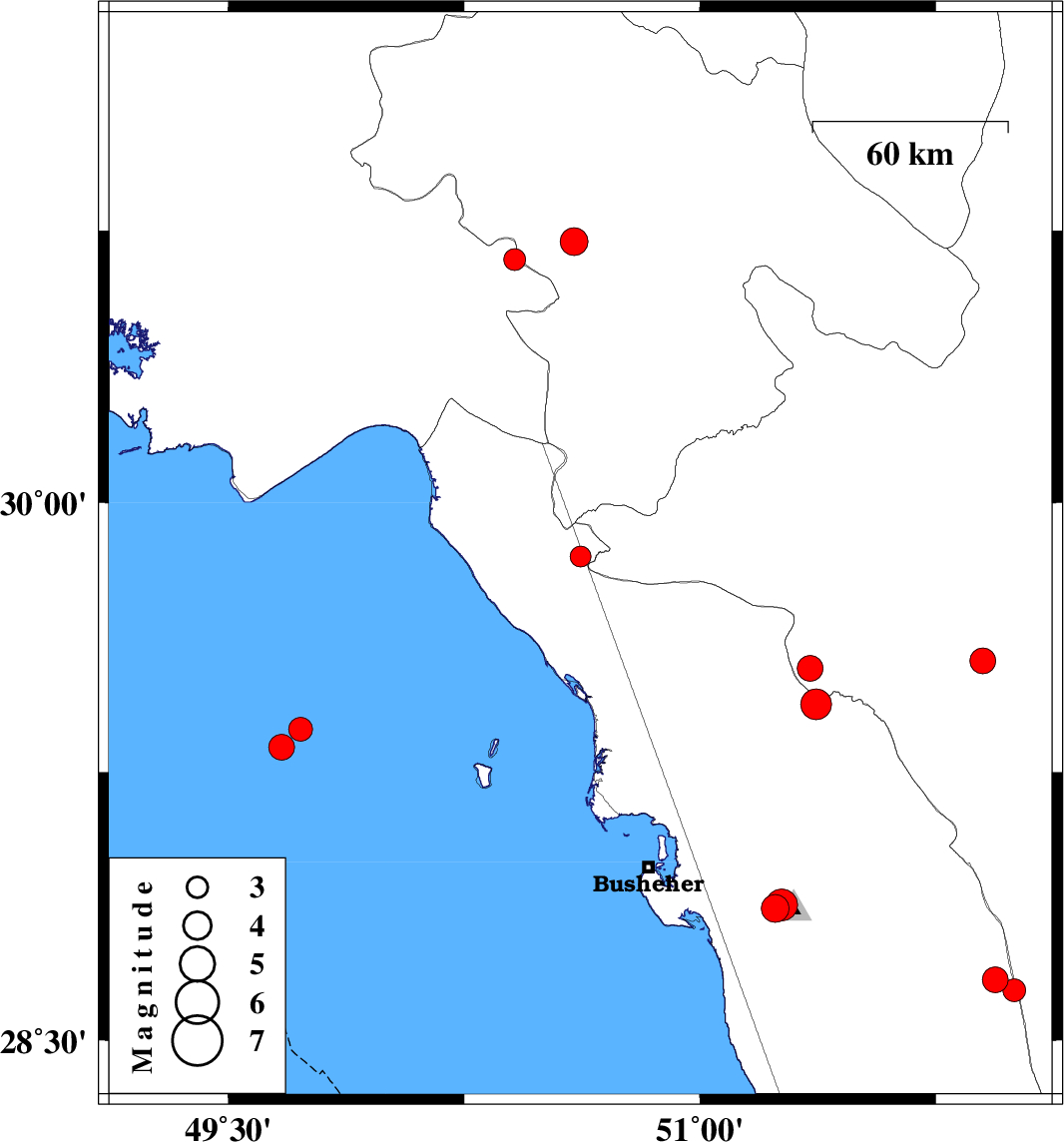 | 2020/09/28 | 08:11:47.7 | 11:41:47.7 | 28.87 | 51.24 | 10 | ML4 | Bushehr Province, 2 km of Ahram | ||