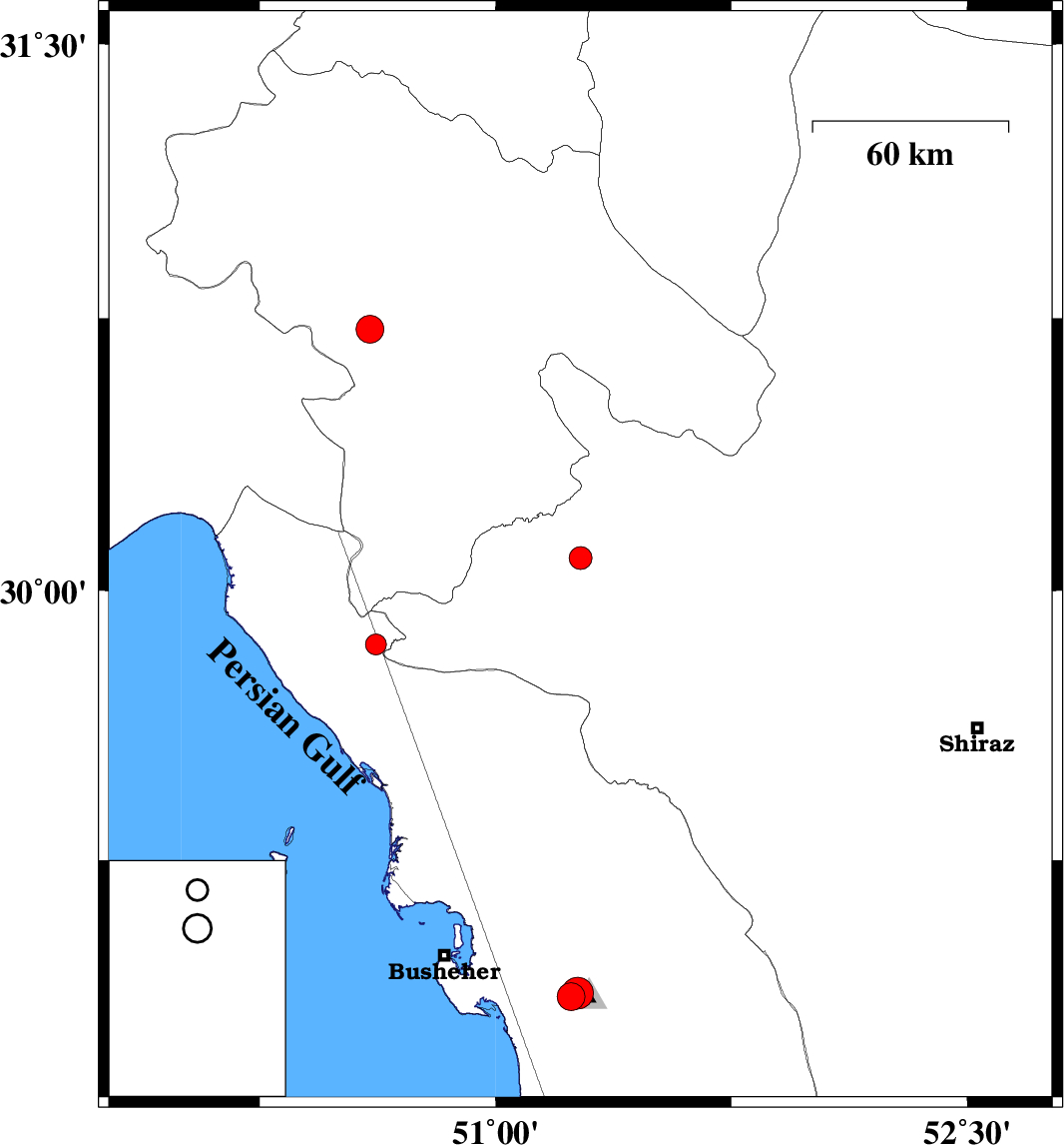 | 2020/09/28 | 08:11:47.7 | 11:41:47.7 | 28.87 | 51.24 | 10 | ML4 | Bushehr Province, 2 km of Ahram | ||
