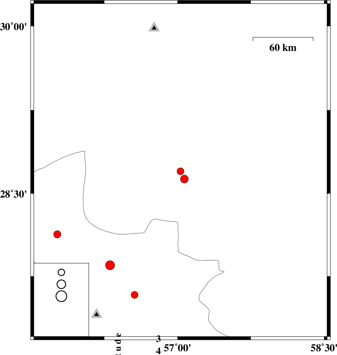 | 2020/10/15 | 13:36:47.9 | 17:06:47.9 | 28.63 | 57.07 | 10 | ML3.6 | Kerman Province, 65 km -West of Jiroft | ||