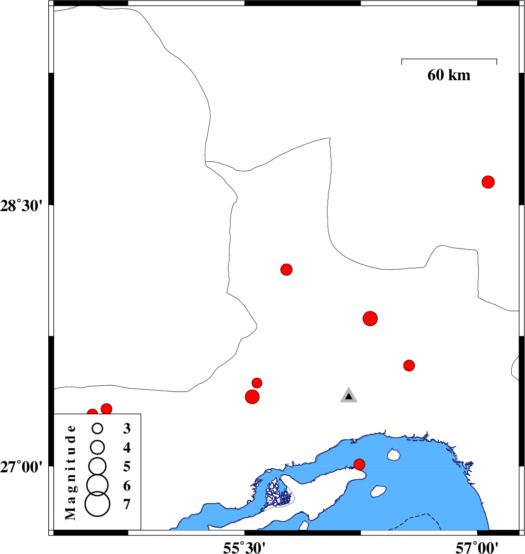 | 2020/10/14 | 14:49:47.6 | 18:19:47.6 | 27.3 | 54.52 | 21 | ML3.1 | Hormozgan Province, 19 km North-East of Bastak | ||