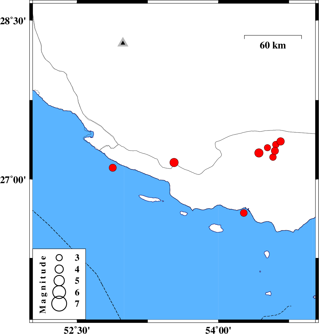 | 2020/10/14 | 14:49:47.6 | 18:19:47.6 | 27.3 | 54.52 | 21 | ML3.1 | Hormozgan Province, 19 km North-East of Bastak | ||