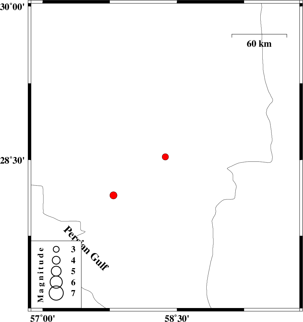 2020/12/04 | 20:40:27.3 | 00:10:27.3 | 28.15 | 57.79 | 10 | ML:3.6 | Kerman Province, 24 km North of Kahnuj |