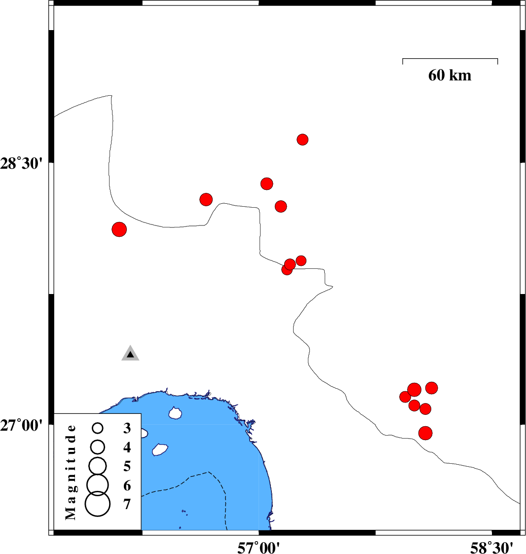 2021/01/07 05:22:41.1 08:52:41.1 27.115810 ML3.3 Kerman Province, 60 km South-East of Manujan