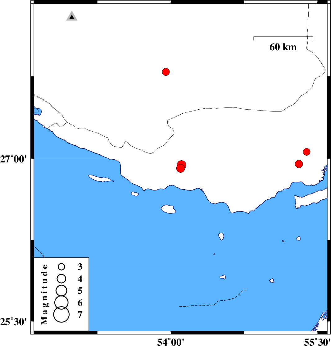 | 2021/01/30 | 09:31:09.9 | 13:01:09.9 | 26.95 | 55.31 | 21 | ML3.5 | Hormozgan Province, 66 km North-East of Bandar-e lengeh |