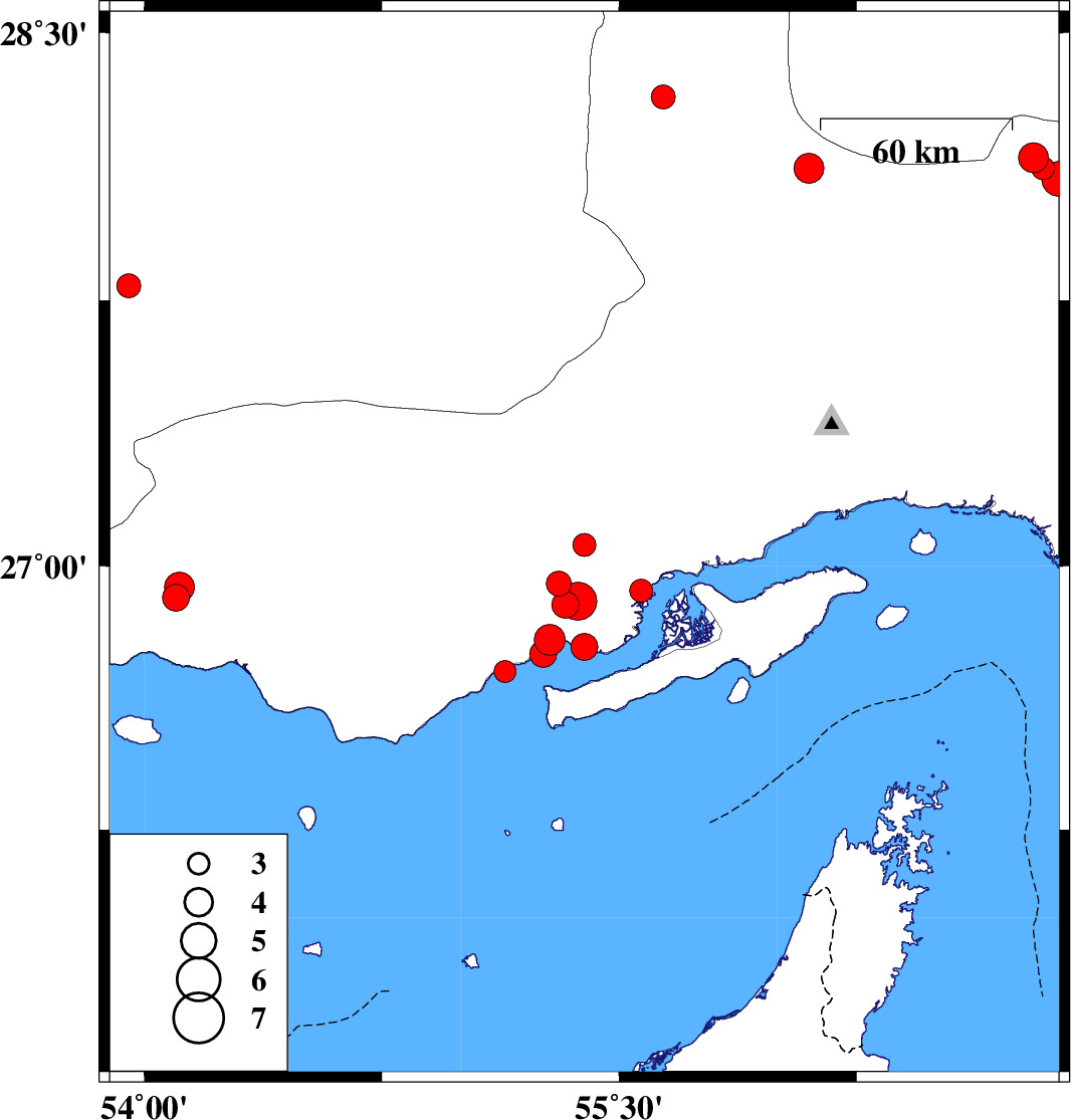 | 2021/02/03 | 05:42:20.9 | 09:12:20.9 | 27.06 | 55.39 | 30 | ML3.3 | Hormozgan Province, 88 km North-West of Qeshm | ||