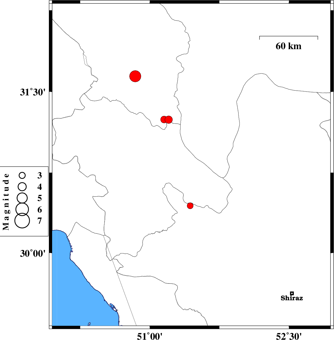 | 2021/01/24 | 18:23:43.2 | 21:53:43.2 | 29.6 | 52.04 | 16 | ML3 | Fars Province, 37 km -East of Kazerun |