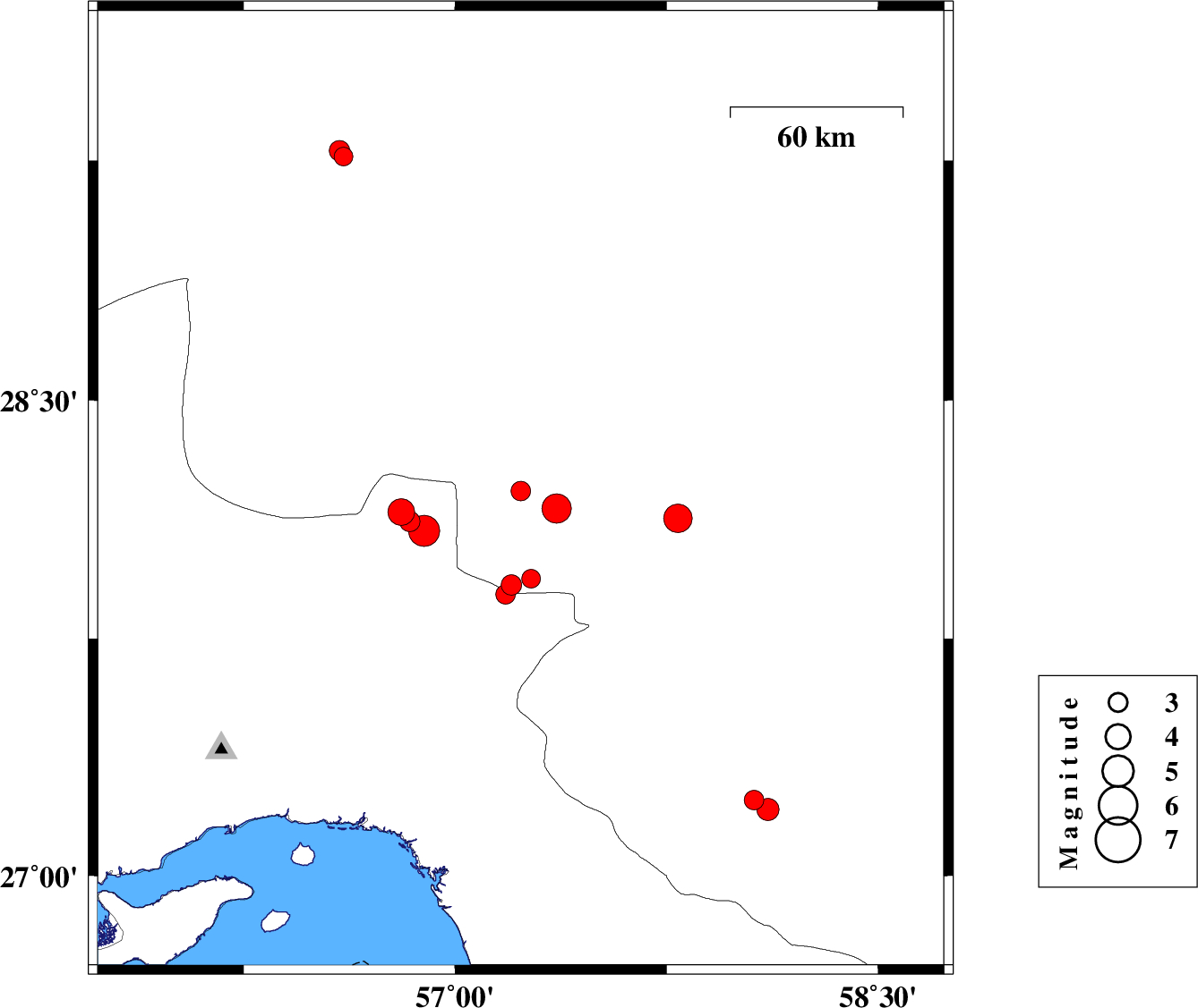 | 2021/01/28 | 18:40:15.1 | 22:10:15.1 | 28.13 | 57.79 | 14 | Mb4.5 | Kerman Province, 22 km North of Kahnuj | ||