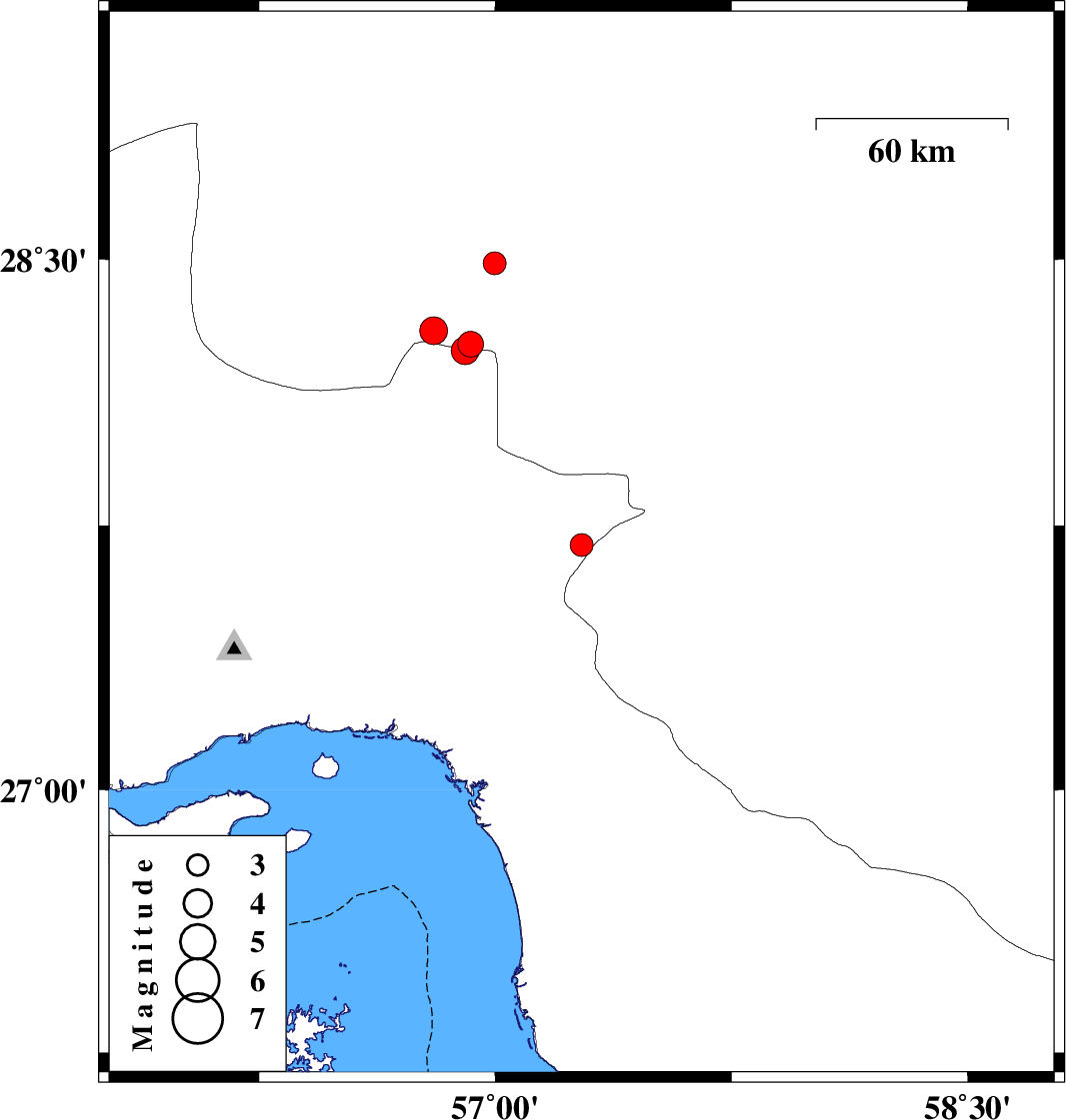 2021/03/02 | 10:12:01.7 | 13:42:01.7 | 28.489 | 56.998 | 12 | ML3.2 | Kerman Province, 75 km South-West of Jiroft |