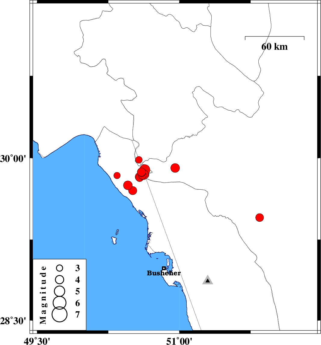 | 2021/05/23 | 09:38:49.2 | 14:08:49.2 | 29.849 | 50.637 | 12 | ML3.8 | Bushehr Province, 33 km North-East of Bandar-e genaveh |