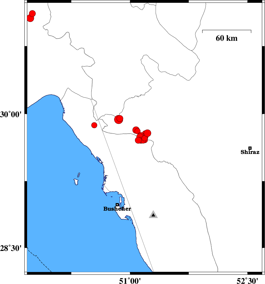 | 2021/07/18 | 14:57:51.1 | 19:27:51.1 | 29.711 | 51.186 | 16 | ML3.5 | Bushehr Province, 50 km North of Borazjan | ||