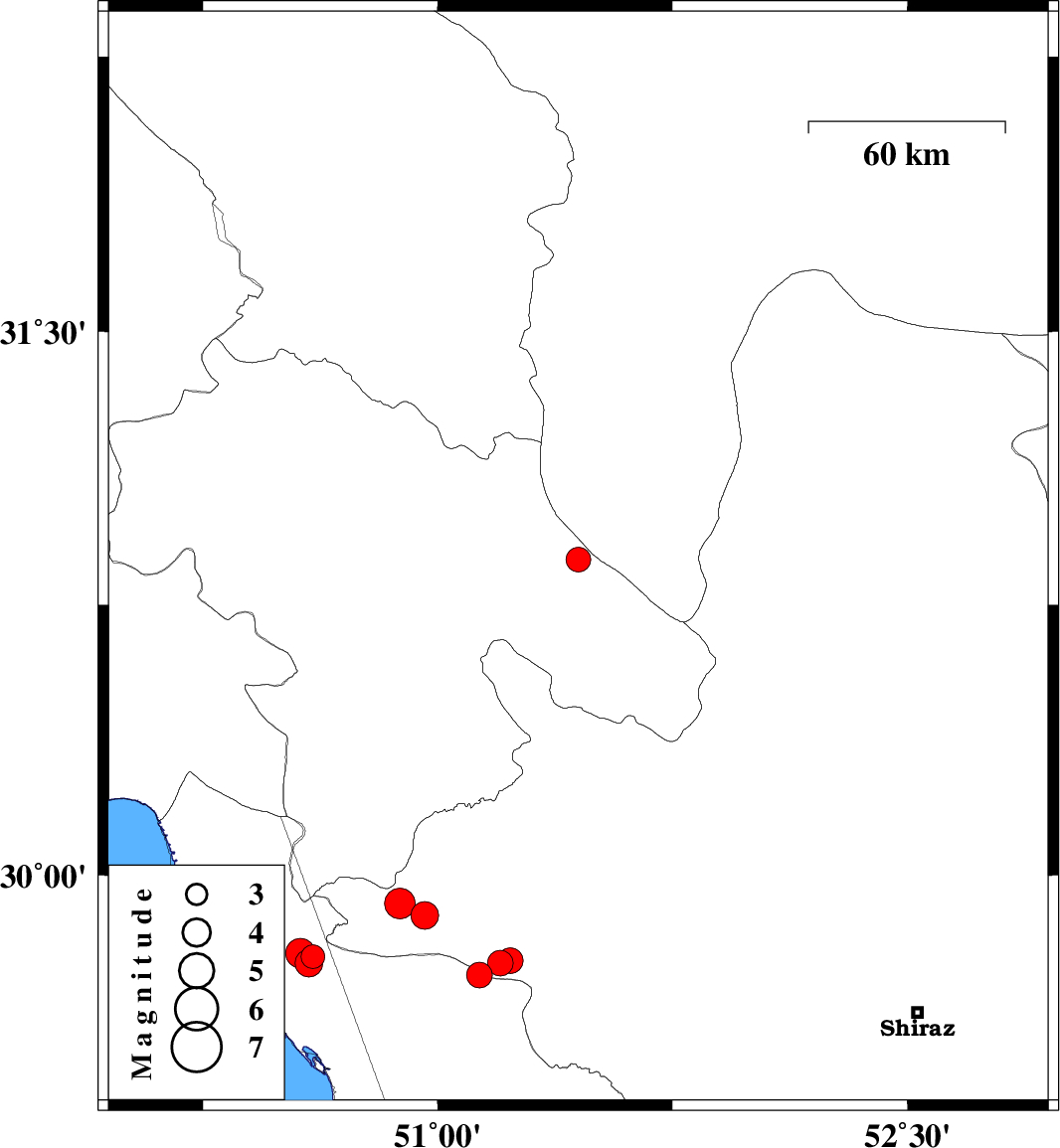 | 2021/08/18 | 05:16:46.0 | 09:46:46.0 | 29.723 | 51.133 | 32 | ML3.7 | Bushehr Province, 52 km North of Borazjan | ||