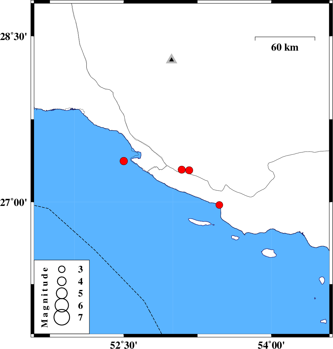 2021/09/19 | 22:11:08.1 | 02:41:08.1 | 27.372 | 52.5 | 12 | ML3.5 | Persian Gulf, 43 km South-West of Mehr | ||