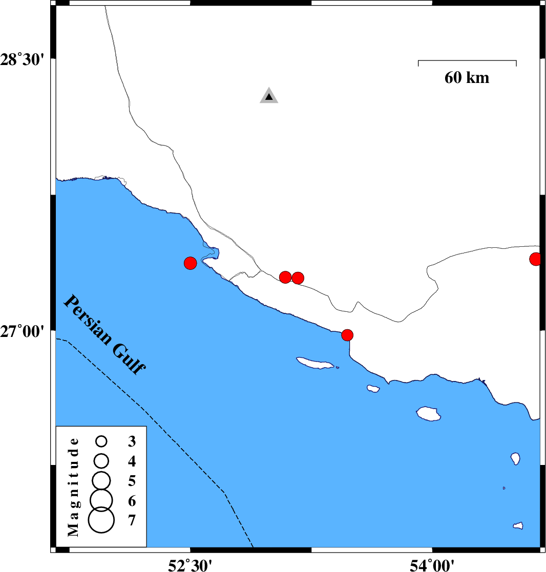 2021/09/19 | 22:11:08.1 | 02:41:08.1 | 27.372 | 52.5 | 12 | ML:3.5 | Persian Gulf, 43 km South-West of Mehr | ||