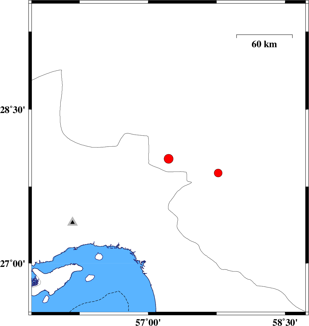 | 2021/09/21 | 08:07:52.6 | 12:37:52.6 | 27.882 | 57.767 | 12 | ML3.9 | Kerman Province, 10 km of Kahnuj |