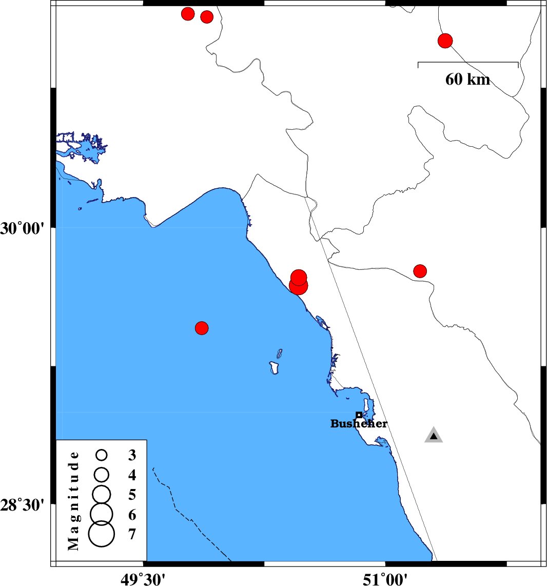 | 2021/10/01 | 02:33:19.4 | 06:03:19.4 | 29.73 | 50.462 | 12 | ML4.5 | Bushehr Province, 18 km North of Bandar-e genaveh | ||